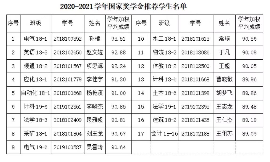 按照山西省学生助学贷款管理中心《关于做好2021年普通高校本专科生国家奖学金工作的通知》(晋教助学函〔2021〕79号)及我院《关于开展2021年国家奖学金评选工作的通知》文件要求,经学生个人申请,班主任推荐,年级主任、学工部审核,我院推荐出了17名同学获国家奖学金,现将推荐学生名单向全院师生公示,公示期为10月12日—10月18日,请广大师生对公示情况进行监督,如有异议请在公示期内及时向学工部资助中心反映。