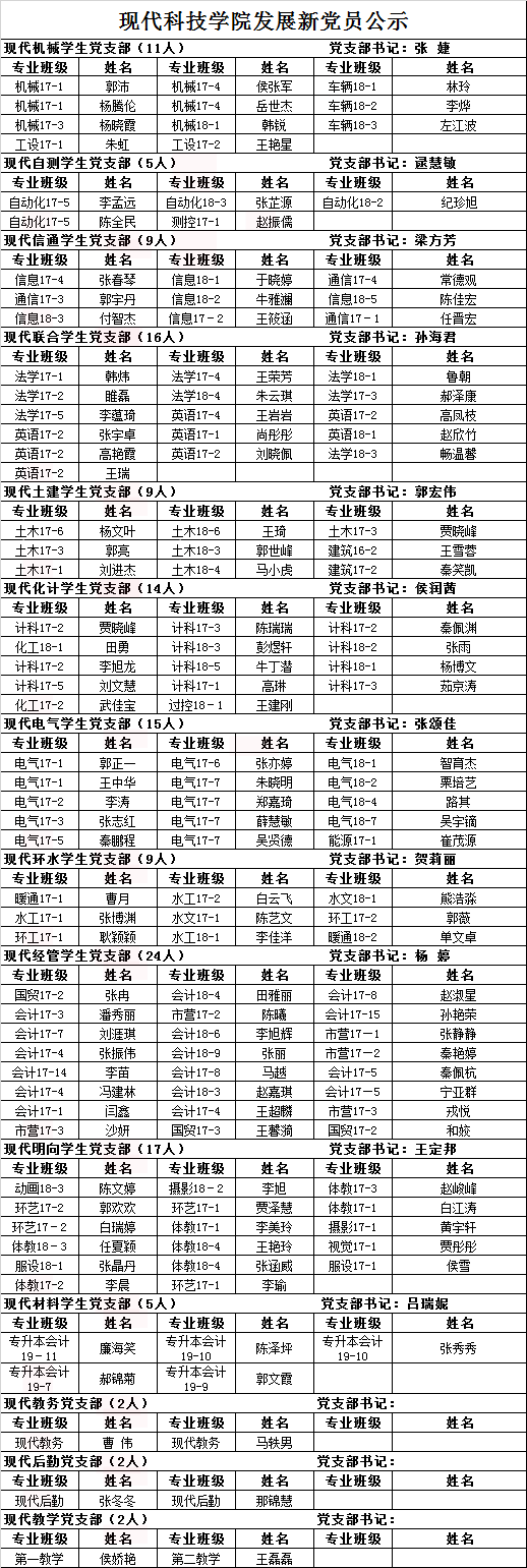 通知公告 当前位置: 学院首页 - 新闻中心 - 通知公告 - 正文 现代科技学院发展新党员公示 时间:2020-12-21浏览量:来源:党建工作部 根据太原理工大学党委发展党员的相关文件精神,经院团组织推优、党校发展对象培训考核、支部联合预审考察、征求党内外群众意见、学院党委审核,拟发展以下134名学生、6名教工加入中国共产党,现予以公示。如有异议,请在公示期内以口头或书面形式向学院党委反映。 联系电话:0351-6018246 公示期为:2020年12月2日--12月6日
